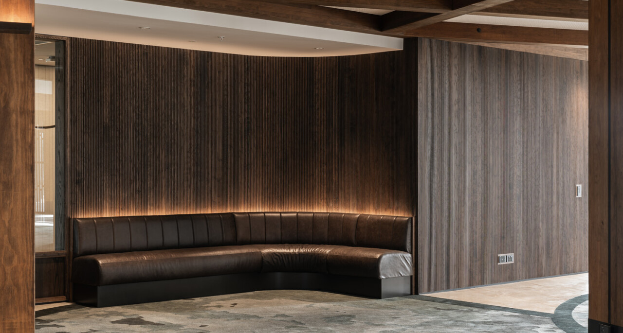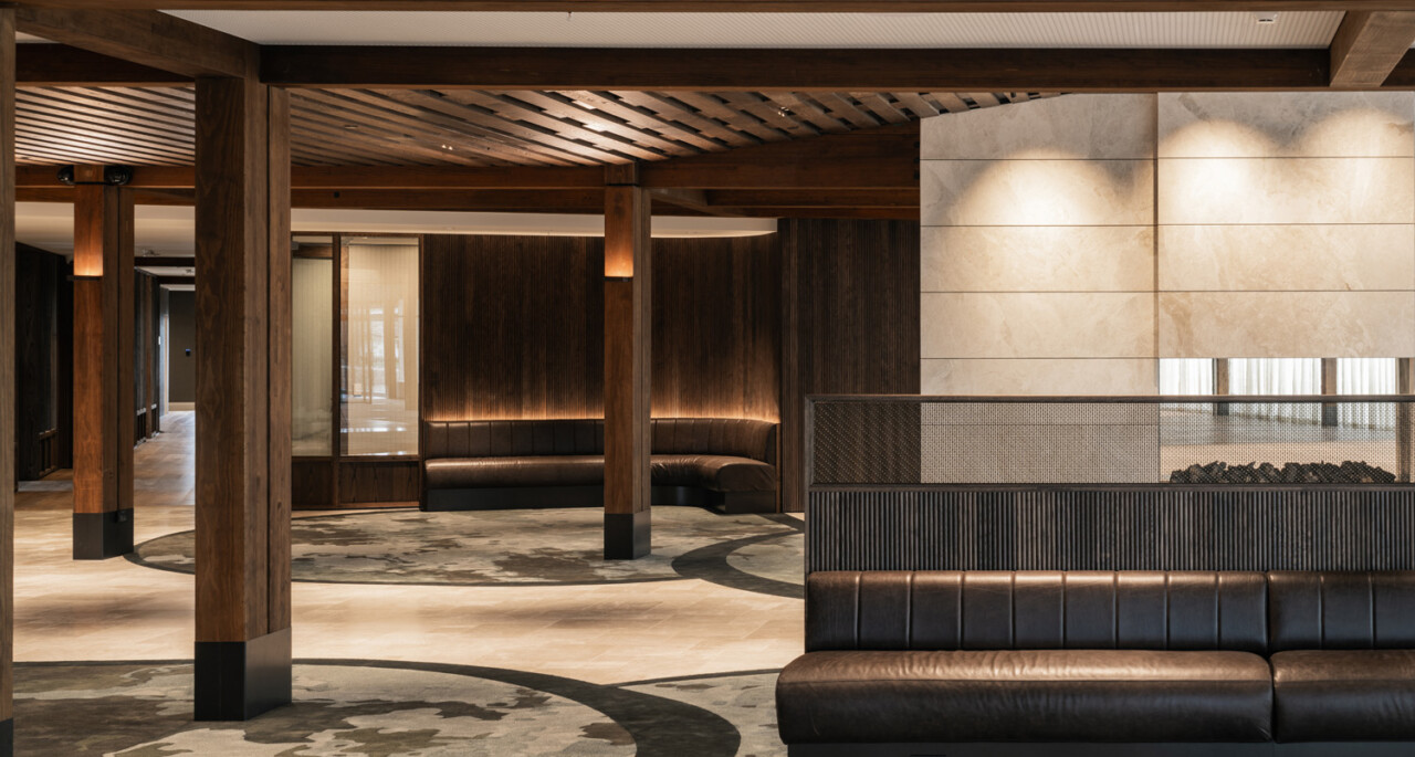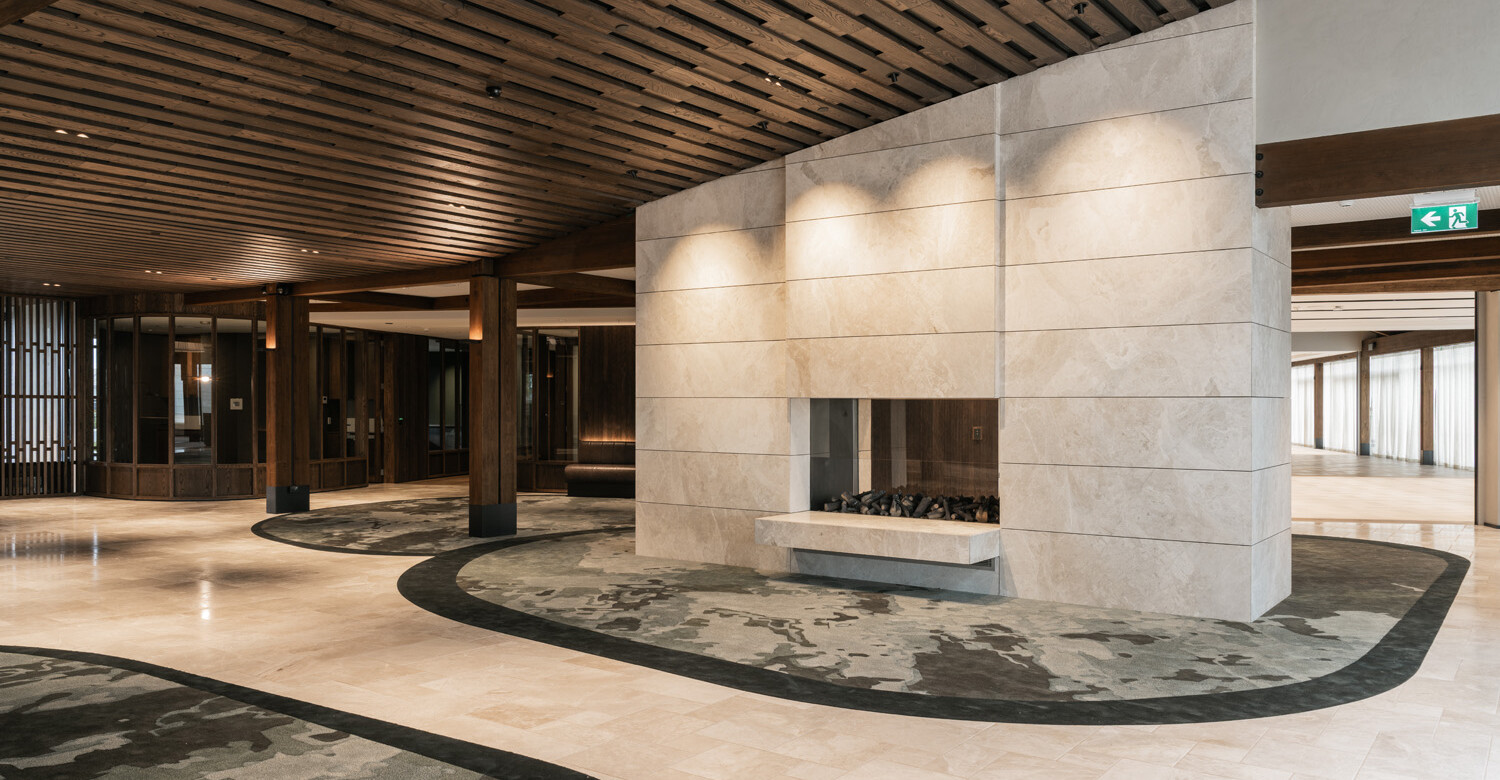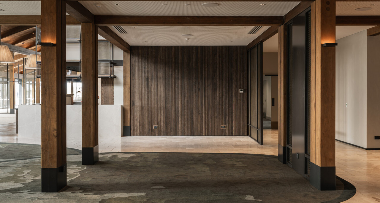The interiors palette centres on rich timber tones, textured wall linings, stone and metal finishes, and layered lighting. Every detail was designed to create warmth, comfort and longevity while maintaining the premium feel expected of the village’s central hub.